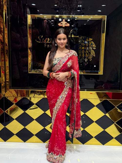 Red Colour Pure Chiffon Bandhani Heavy Handwork Saree (182)