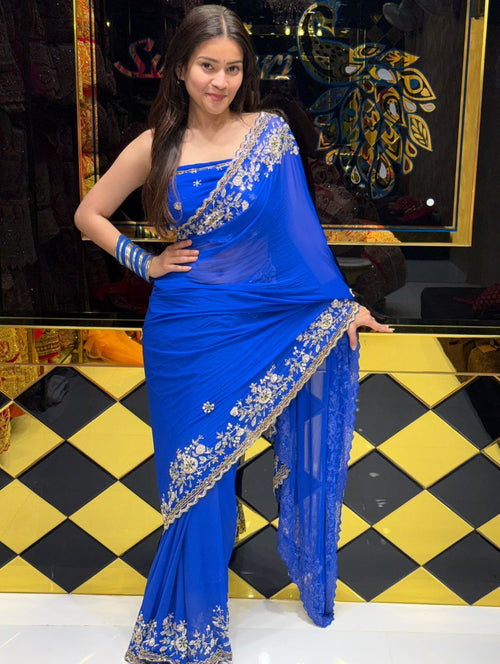 Blue Premium Handwork Pure Chiffon Saree (195)