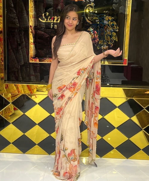 Premium Beige Floral Handwork Designer Saree (246)
