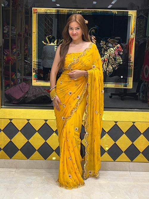 Yellow Multiple Sequence Handwork Chiffon Saree (267)
